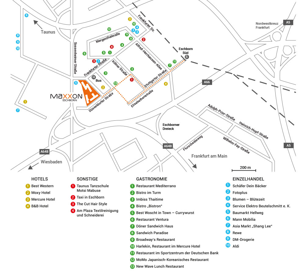 MaXXON ist hervorragend an das Autobahnnetz angeschlossen. Die Autobahn A5, Hannover-Frankfurt-Basel, befindet sich ca. 1,5 km östlich der Stadtgrenze. Unmittelbar an der südlichen Stadtgrenze Eschborns verläuft die Autobahn A66, Wiesbaden-Frankfurt.